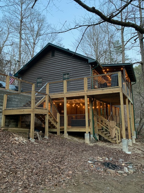 Complete remodel of this riverfront cabin in Walland TN. Kitchen moved to front of house, laundry center installed, and both bathroom renovated. Custom stone shower and ship lap in the master bedroom. All new decking, hog wire railing, and a new shed roof installed on back porch. New footings to support the rear deck and hot tub.